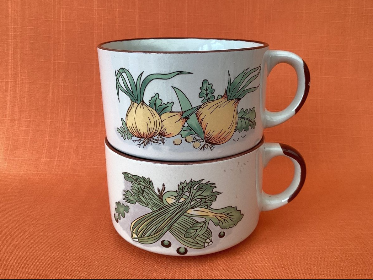 Set of 2 retro soup bowls with handles, two different designs onion and celery, vegetarian soup bowls, rustic soup bowls, Shell soup mugs